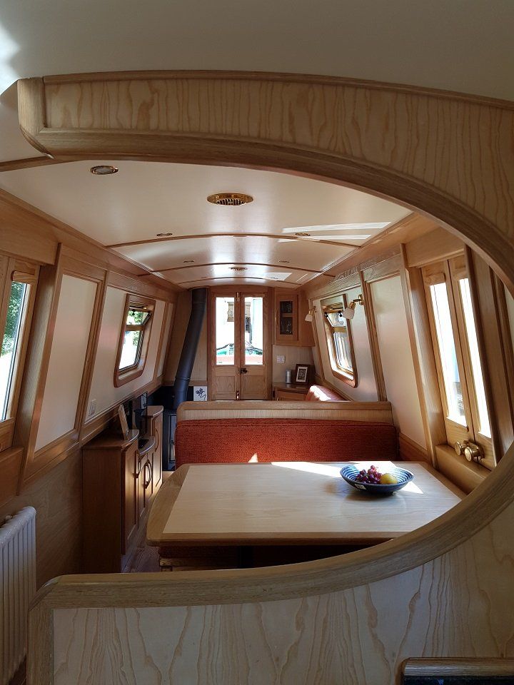 A lovely boat with all mod cons and stylish interior. A Charnwood solid fuel stove and Webasto central heating system heat this boat. The white columns radiators have been made a feature throughout. The matching settee and dinette colours blend themselves beautifully to the oak surrounds and white painted panels along with brass fittings.
