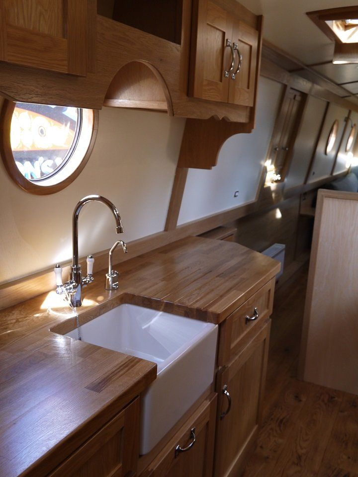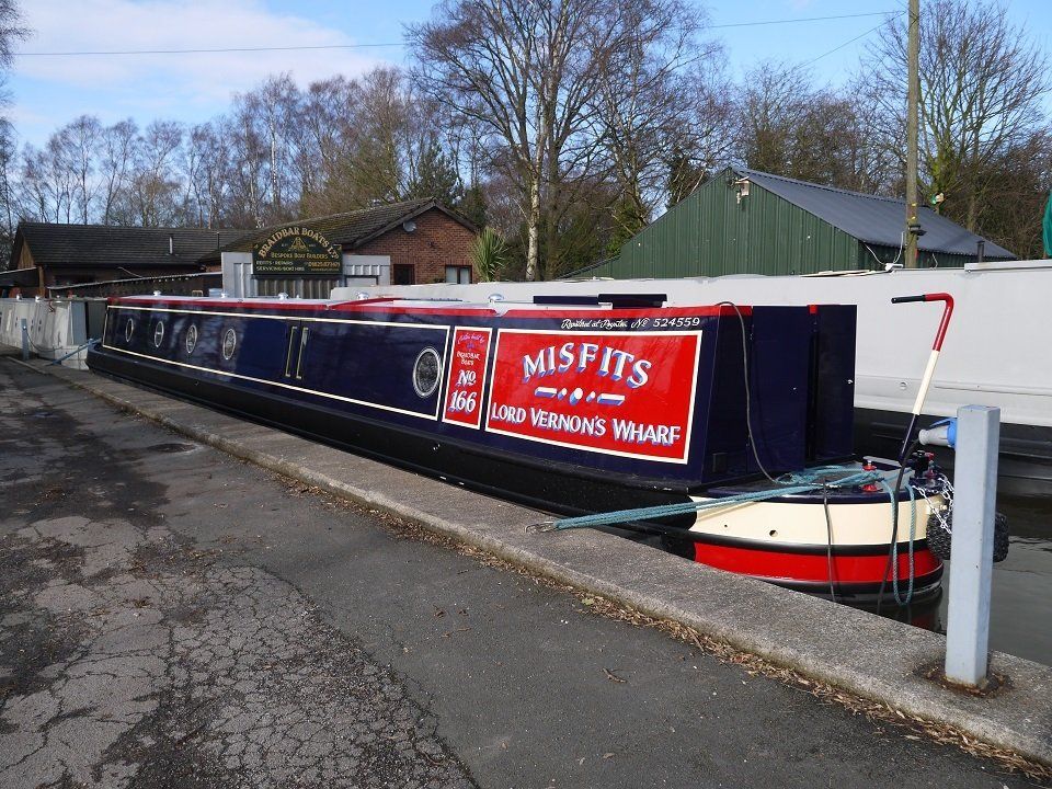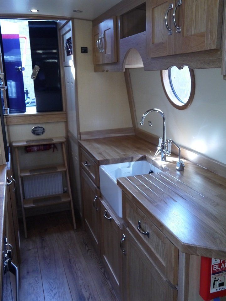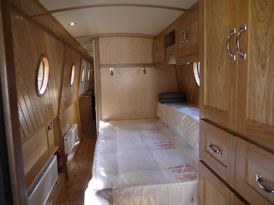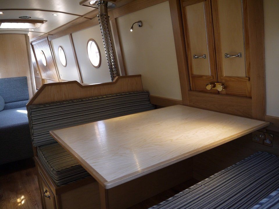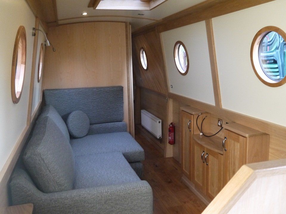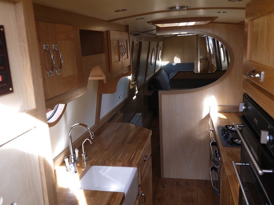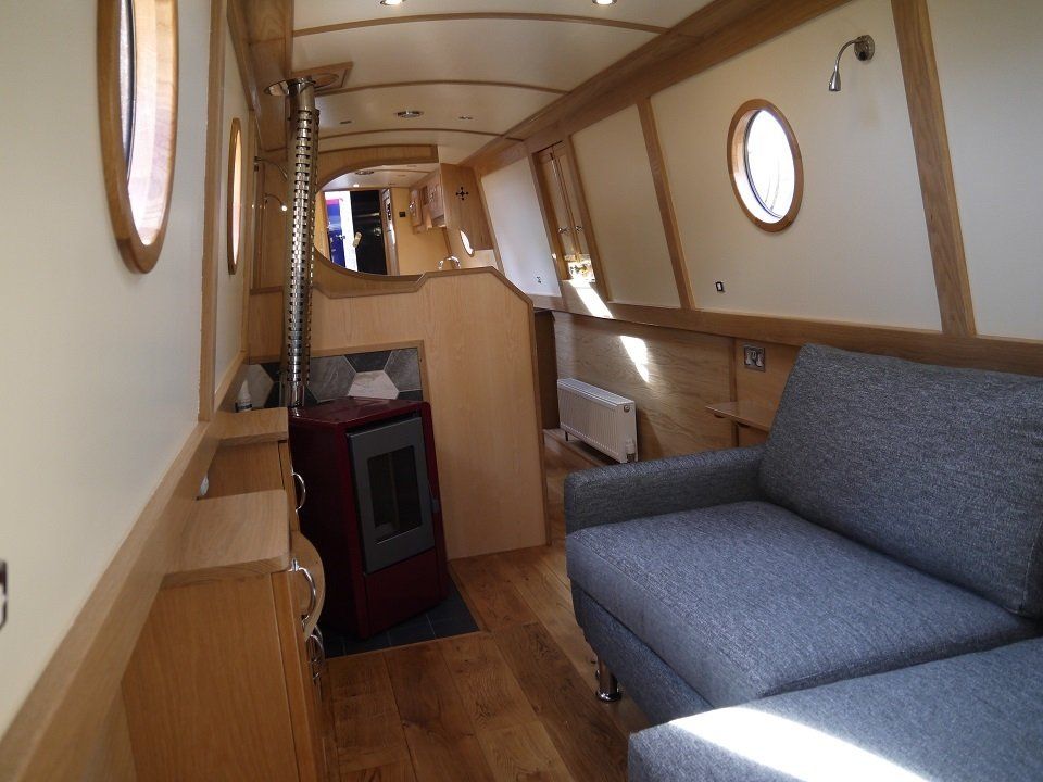 Misfits is a 60’ Semi-Trad-style narrow boat with a reverse interior layout. It has double-glazed Satin Silver anodised port holes, a Houdini in both the bedroom and galley, and glazed side hatches on both sides of the dinette.
